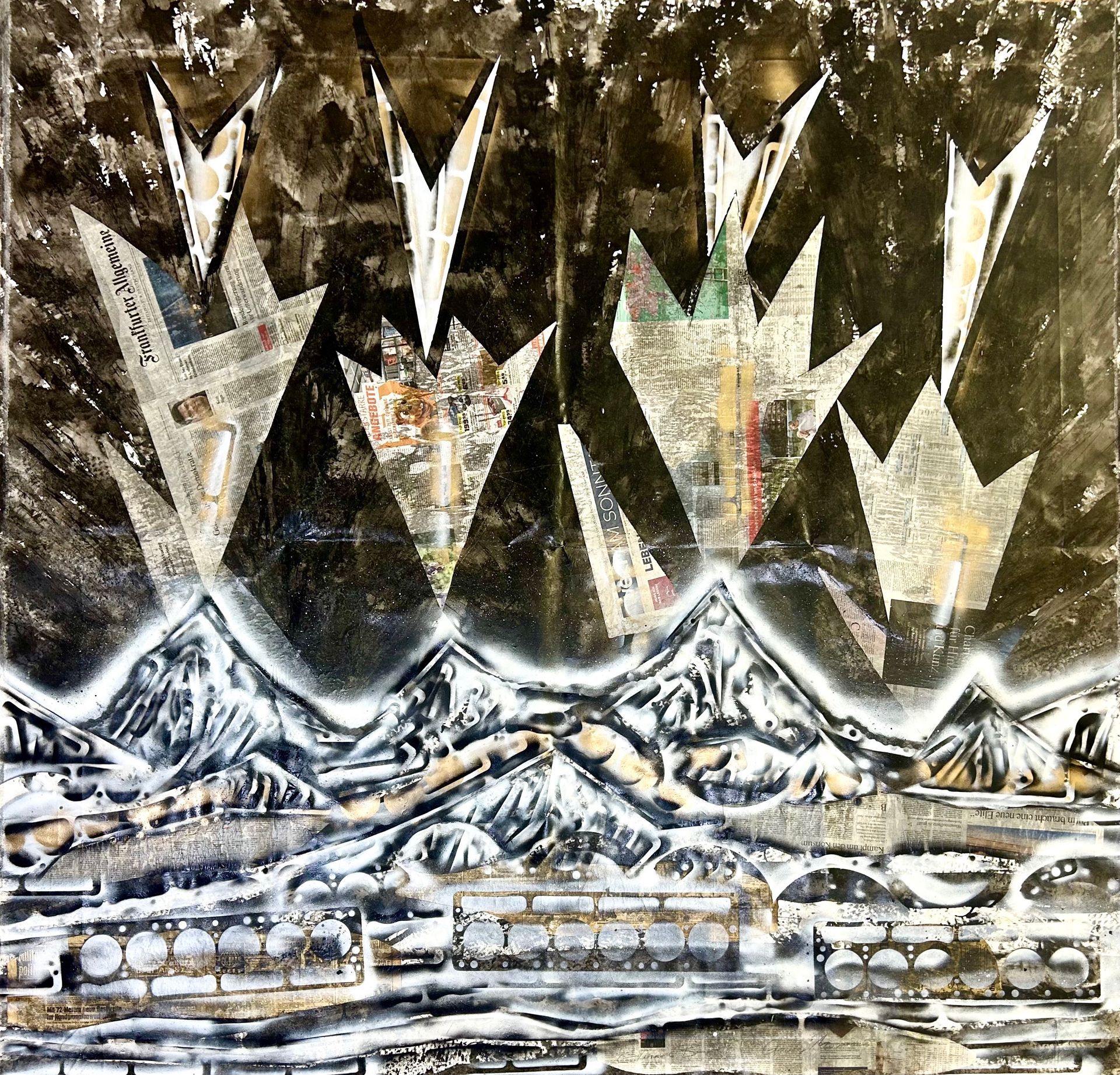 MARCUS SENDLINGER, GLOWING MOUNTAINS, 2025, MIXED MEDIA ON CANVAS, 215 X 215 CM.